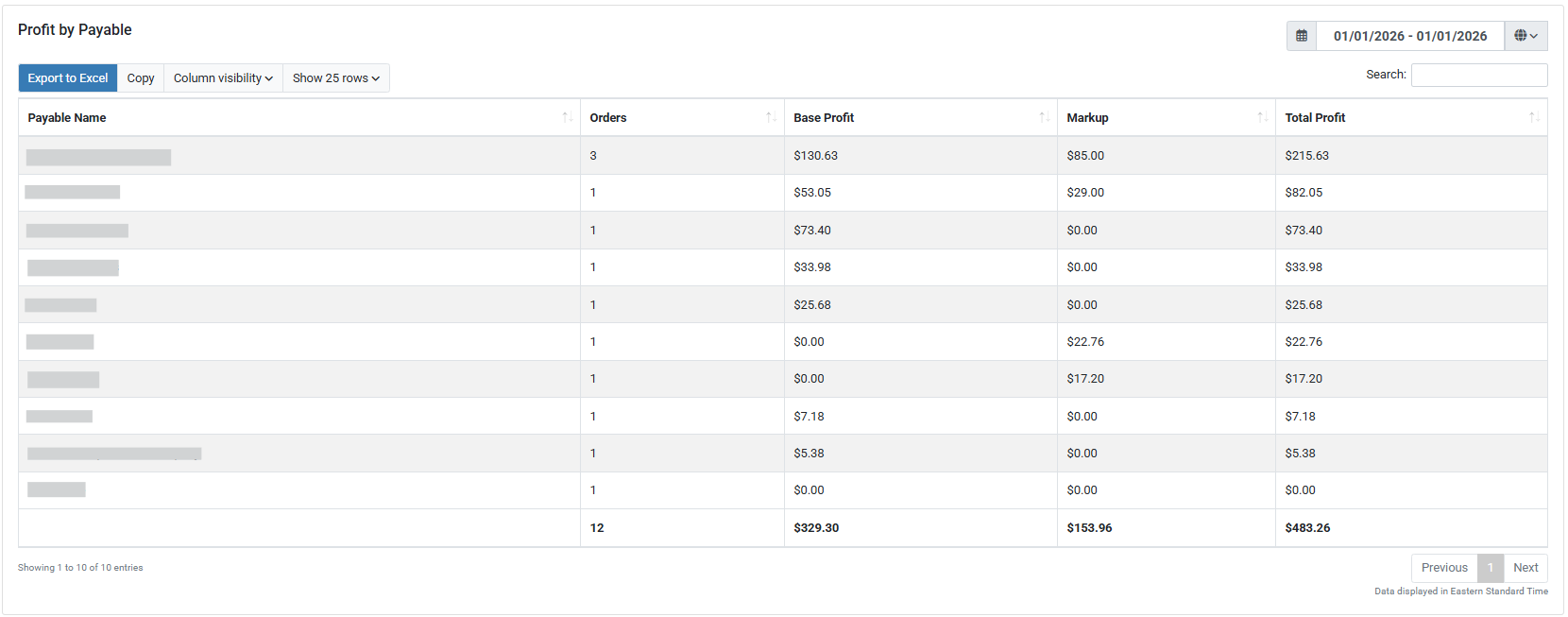 The Profit by Payable report will provide a summary of Total Commission owed to each Shop Creator and Shop Payable (as demonstrated below).